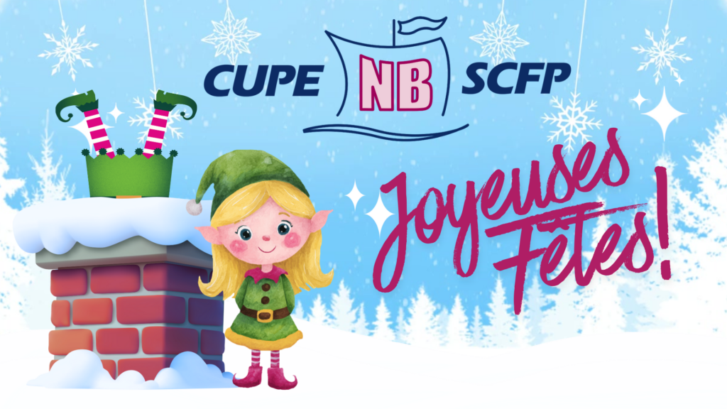 Bonjour, ici Iris Loyd, présidente du SCFP NB. En cette période festive, célébrons l’ensemble des travailleuses et travailleurs de la province, qui offrent les services publics dont nous bénéficions tous. Le SCFP NB vous souhaite de joyeuses fêtes!