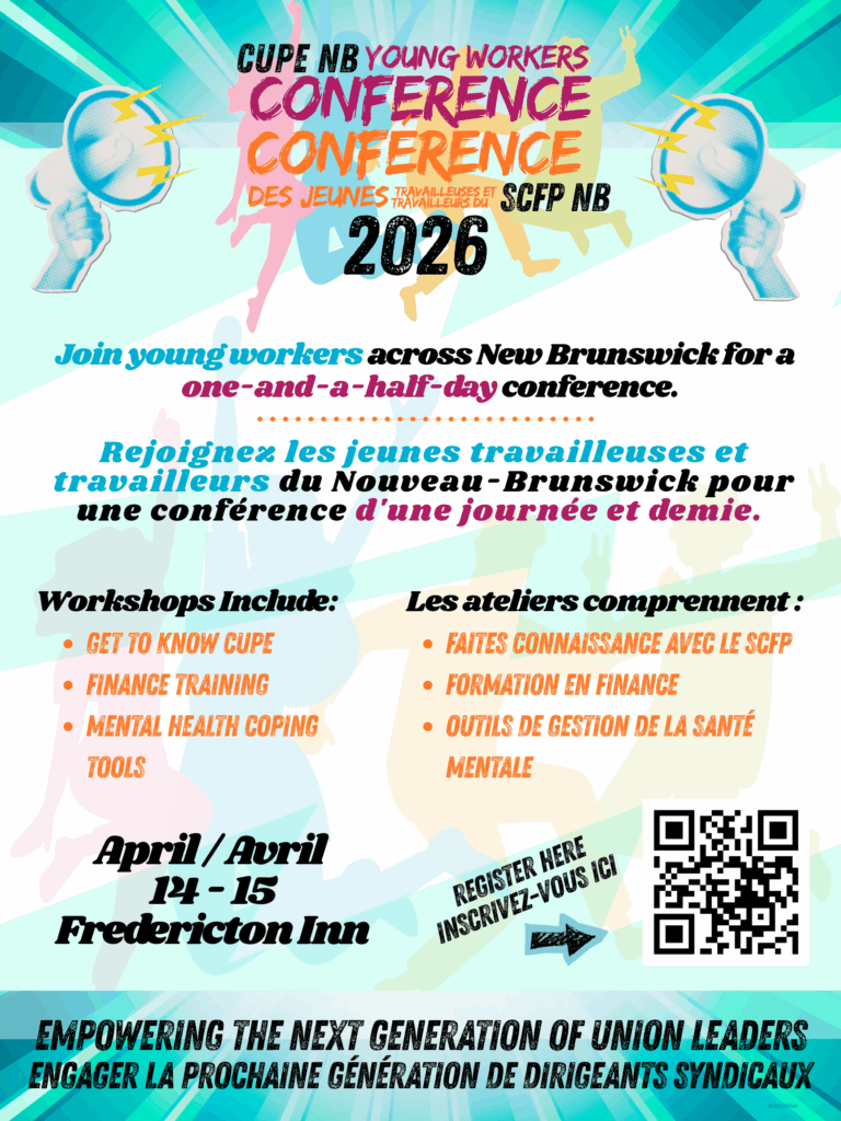 Attention jeunes travailleuses et travailleurs du Nouveau-Brunswick ! Il n’est pas trop tard pour s’inscrire à la Conférence des jeunes travailleuses et travailleurs du SCFP NB 2026. Inscrivez-vous ici : https://luma.com/jlh0hess Share this: Click to share on Facebook (Opens in new window) Facebook Click to share on X (Opens in new window) X