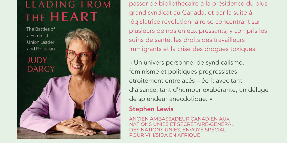 Leading from the Heart par Judy Darcy – Dialogue avec Iris Lloyd Dans ce mémoire riche et inspirant, Judy Darcy raconte les tournants remarquables qui l’ont fait passer de bibliothécaire à la présidence du plus grand syndicat au Canada, et par la suite à législatrice révolutionnaire se concentrant sur plusieurs de nos enjeux pressants, y compris les soins de santé, … Read More